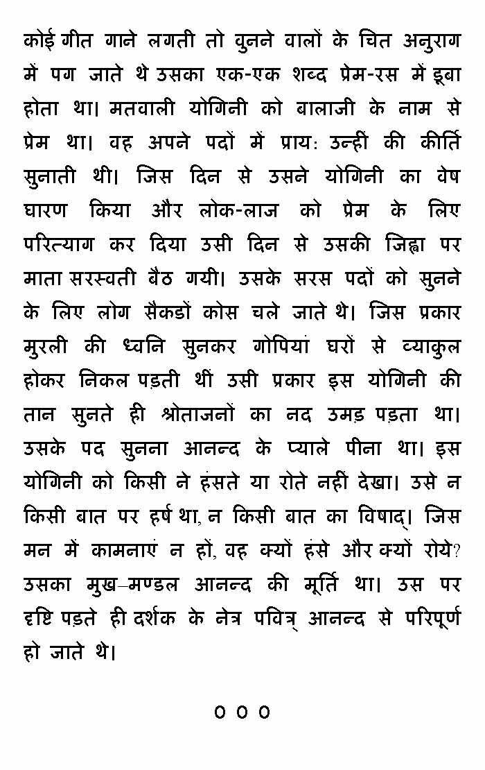 इस प्रकार के मद से मतवाली योगिनी को एक स्थल पर शांति न मिलती थी। पुष्प की सुगंधि की भांति देश-देश भ्रमण करती और प्रेम के शब्द सुनाती फिरती थी। उसके पीतवर्ण पर गेरुए रंग का वस्त्र परम शोभा देता था। इस प्रेम की मूर्ति को देखकर लोगों के नेत्रों से अश्रु टपक पडते थे। जब अपनी वीणा बजाकर कोई गीत गाने लगती तो वुनने वालों के चित अनुराग में पग जाते थे उसका एक-एक शब्द प्रेम-रस में डूबा होता था। मतवाली योगिनी को बालाजी के नाम से प्रेम था। वह अपने पदों में प्राय: उन्हीं की कीर्ति सुनाती थी। जिस दिन से उसने योगिनी का वेष घारण किया और लोक-लाज को प्रेम के लिए परित्याग कर दिया उसी दिन से उसकी जिह्वा पर माता सरस्वती बैठ गयी। उसके सरस पदों को सुनने के लिए लोग सैकडों कोस चले जाते थे। जिस प्रकार मुरली की ध्वनि सुनकर गोपियां घरों से व्याकुल होकर निकल पड़ती थीं उसी प्रकार इस योगिनी की तान सुनते ही श्रोताजनों का नद उमड़ पड़ता था। उसके पद सुनना आनन्द के प्याले पीना था। इस योगिनी को किसी ने हंसते या रोते नहीं देखा। उसे न किसी बात पर हर्ष था, न किसी बात का विषाद्। जिस मन में कामनाएं न हों, वह क्यों हंसे और क्यों रोये? उसका मुख–मण्डल आनन्द की मूर्ति था। उस पर दृष्टि पड़ते ही दर्शक के नेत्र पवित्र् आनन्द से परिपूर्ण हो जाते थे।